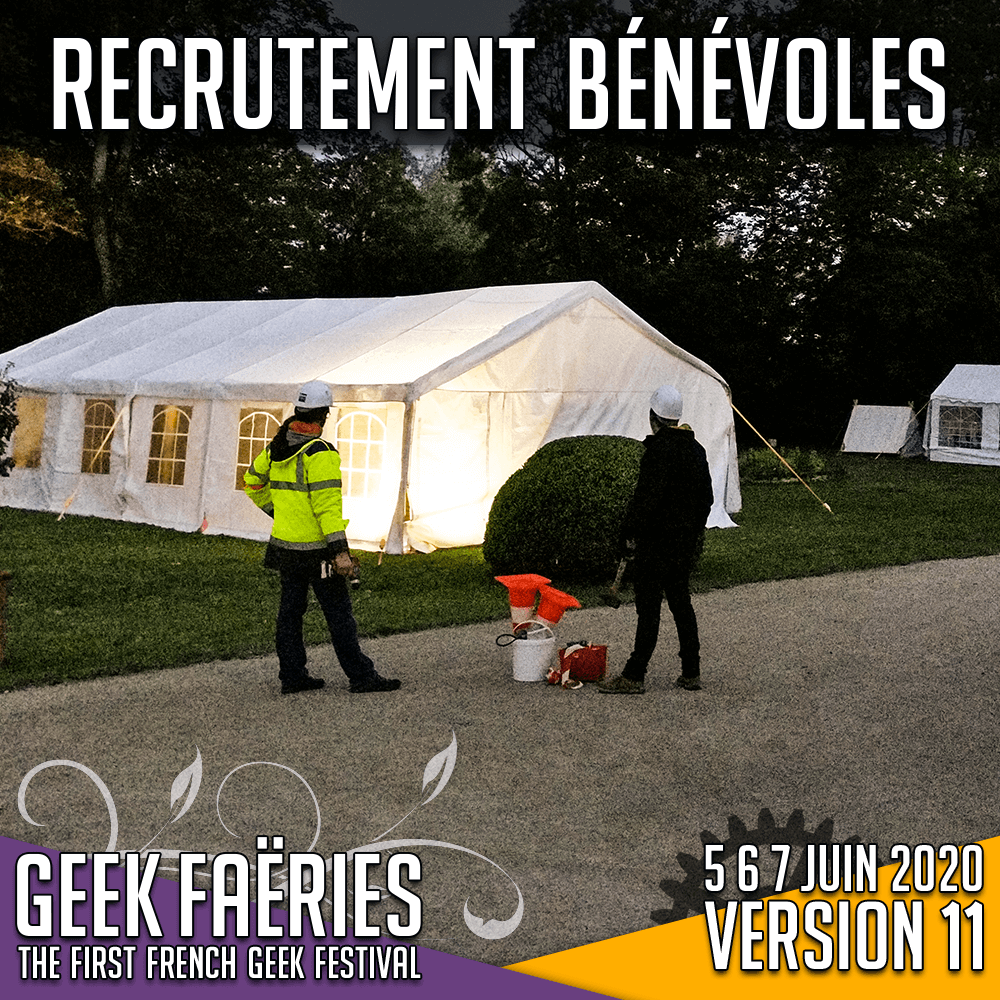 Être bénévole aux Geek Faëries c’est une expérience technique différente pour 4 raisons : le festival a lieu début juin, en extérieur, de jour et de nuit et se consacre à plusieurs sujets. C’est autant de challenges à relever et d’inattendus auxquels il va falloir faire face.